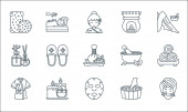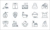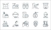 ikony linii spa. zestaw liniowy. wysokiej jakości zestaw linii wektorowych, takich jak masaż twarzy, słoik miodu, olejek eteryczny, kapcie, wanna, akupunktura, sauna, mydło