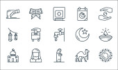 ikony linii islamu i ramadanu. zestaw liniowy. wysokiej jakości zestaw linii wektorowych, takich jak wieczór, Koran, meczet, kalendarz, hidżab, meczet, latarnie, zam zam zam