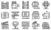 ikony linii kina. zestaw liniowy. wysokiej jakości zestaw linii wektorowych, takich jak krzesło reżyserskie, tablica historii, scenariusz, bilety do kina, popcorn, operator kamery, aktorzy, głośnik audio, ramka do filmu