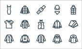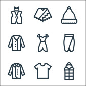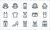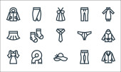 ikony linii mody. zestaw liniowy. wysokiej jakości zestaw linii wektorowych, takich jak sweter, sukienka, sukienka, spódnica, dzwon, but, sukienka, spódnica, torebka