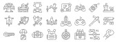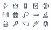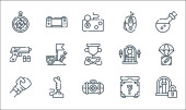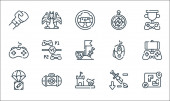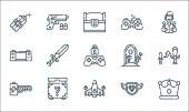 ikony linii gier wideo. zestaw liniowy. wysokiej jakości zestaw linii wektorowych, takich jak diament, motyka, platforma, końcowy szef, amunicja, torba pieniędzy, podium, wieża, mapa gry