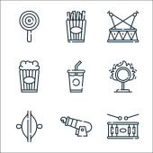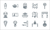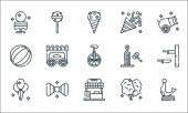 ikony linii cyrkowej. zestaw liniowy. wysokiej jakości zestaw linii wektorowych, takich jak wąż, napój bezalkoholowy, cyrk, megafon, karmelizowane jabłko, piłka plażowa, jednokołowy, wagon, wata cukrowa