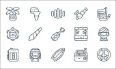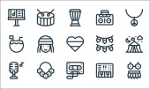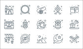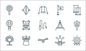 ikony linii cyrkowej. zestaw liniowy. wysokiej jakości zestaw linii wektorowych, takich jak bęben, girlandy, karta tarota, plakat, flaga, napój bezalkoholowy, popcorn, karmelizowane jabłko, magiczny kapelusz