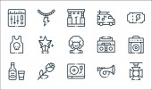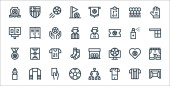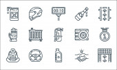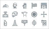 ikony wyścigów samochodowych. zestaw liniowy. zestaw linii wektorowych jakości, takich jak trofeum, opona, bieg, olej, meta, stożek drogowy, uścisk dłoni, filtr powietrza, amortyzator