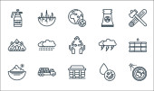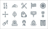 ikony wyścigów samochodowych. zestaw liniowy. zestaw linii wektorowych jakości, takich jak inżynieria, narzędzia, kierowca, flaga mety, amortyzator, zbiornik tlenu, prędkościomierz, bieg, sygnalizacja świetlna