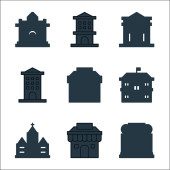 ikony linii budynków miejskich. zestaw liniowy. zestaw linii wektorowych jakości, takich jak obserwatorium, weterynarz, dwór, dom, hostel, sklep, laboratorium, kiosk, ratusz