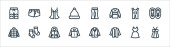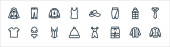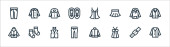 ikony linii ubrań. zestaw liniowy. wysokiej jakości zestaw linii wektorowych, takich jak wysokie obcasy, gorset, spódnica, kurtka, jeansy, pamela kapelusz, szlafrok, spodnie