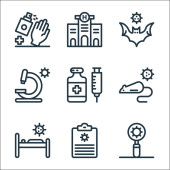 ikony linii koronawirusów. zestaw liniowy. zestaw linii wektorowych jakości, takich jak apteczka pierwszej pomocy, kwarantanna, ostrzeganie przed wirusami, koronawirus, pogotowie ratunkowe, płuca, lekarz, termometr, koronawirus