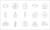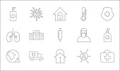 ikony linii koronawirusów. zestaw liniowy. zestaw linii wektorowych jakości, takich jak ambulans, dezynfektor rąk, apteczka pierwszej pomocy, płuca, kwarantanna, dezynfektor rąk, koronawirus, tarcza medyczna, ostrzeżenie przed wirusami