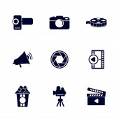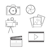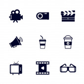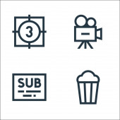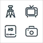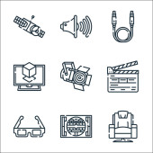 ikony linii kina. zestaw liniowy. wysokiej jakości zestaw linii wektorowych, takich jak kamera, mikrofon, klapa, soda, rolka filmu, odtwarzacz wideo, dywan, kamera wideo
