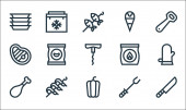 ikony płaskiej linii grilla. zestaw liniowy. wysokiej jakości zestaw linii wektorowych, takich jak butelka sosu, sztućce, kiełbasa, grill, kukurydza, nóż, papryka, dzienniki