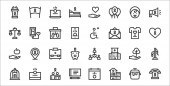 ikony linii charytatywnej. zestaw liniowy. zestaw linii wektorowych jakości, takich jak dawstwo krwi, transfuzja krwi, oddawanie krwi, kobieta, schronienie, organizacja charytatywna, wsparcie, apteczka pierwszej pomocy, organizacja charytatywna