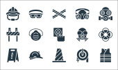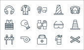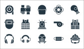 płaskie ikony ratownicze i ochronne. zestaw liniowy. wysokiej jakości zestaw linii wektorowych, takich jak kamizelka ratunkowa, wąż strażacki, maska ochronna, fartuch laboratoryjny, maska ochronna, maska spawalnicza, kamizelka ratunkowa, kamizelka ratunkowa