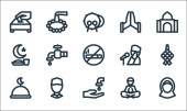 ikony linii Ramadan. zestaw liniowy. wysokiej jakości zestaw linii wektorowych, takich jak półksiężyc, post, pocieranie el hizb, kalendarz, kaaba, meczet, muzułmanie, różaniec, dywan