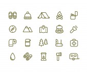 ikony obozowiska. zestaw liniowy. wysokiej jakości zestaw linii wektorowych, takich jak drzewo, liść, śnieg, grill, kawa, buty, plecak, satay, drewno