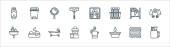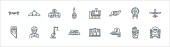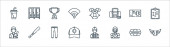 Ikony sławy. zestaw liniowy. wysokiej jakości zestaw linii wektorowych, takich jak latarka, dywan, samoloty, reflektory, trofeum, flaga, czat wideo, trofeum