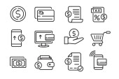 ikony linii zakupów online. zestaw liniowy. wysokiej jakości zestaw linii wektorowych, takich jak mastercard, bankomat, pieniądze