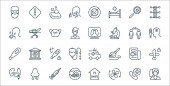 ikony linii artykułów medycznych. zestaw liniowy. zestaw linii wektorowych jakości, takich jak tradycyjne, szpital, zdrowie, rentgen, chemia, szczepionka, AIDS, waga, tarcza