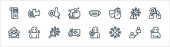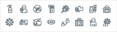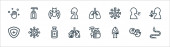 płaskie ikony linii covid. zestaw liniowy. wysokiej jakości zestaw linii wektorowych, takich jak choroba, wyszukiwanie wirusów, pobyt w domu, kichanie, płuca, gorączka, karetka