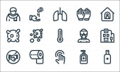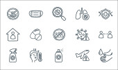 płaskie ikony linii covid. zestaw liniowy. zestaw linii wektorowych jakości, takich jak wyszukiwanie wirusów, maska twarzy, płuca, choroba, gorączka, gorączka, nietoperz, nietoperz, ochrona