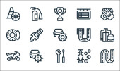 ikony dnia pracy. zestaw liniowy. wysokiej jakości zestaw linii wektorowych, takich jak śruba, stożek ruchu, piła, młot pneumatyczny, cegła ściany, bariera ruchu, piła tarczowa, narzędzie do naprawy