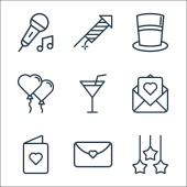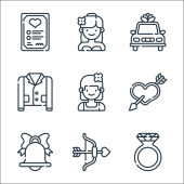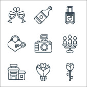 ikony linii ślubnej. zestaw liniowy. wysokiej jakości zestaw linii wektorowych, takich jak butelka wina, przekąski, kamera wideo, prezenty, ślub, girlandy, naszyjnik, propozycja