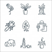 ikony linii ogrodniczej. zestaw liniowy. wysokiej jakości zestaw linii wektorowych, takich jak nożyczki, fontanna, ogrodnik, wiewiórka, łopaty, spray, ogrodnik, rośliny