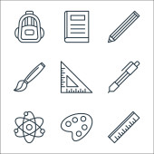 ikony linii szkolnej. zestaw liniowy. wysokiej jakości zestaw linii wektorowych, takich jak plecak, pisanie, dokument, sześcian, sześcian, nauczyciel, klej, karta identyfikacyjna