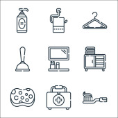 ikony higieniczne rutynowych linii. zestaw liniowy. wysokiej jakości zestaw linii wektorowych, takich jak higiena zębów, mop, gumowe rękawice, czyszczenie okien, tłok, terminarz, gąbka, pudełko na tkanki