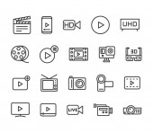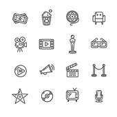 ikony linii kina. zestaw liniowy. wysokiej jakości zestaw linii wektorowych, takich jak kino, led TV, stara kamera wideo, projektor, megafon, projektor, bilety, teatr, klapperboard
