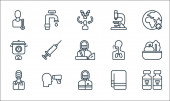 ikony linii koronawirusów. zestaw liniowy. wysokiej jakości zestaw linii wektorowych, takich jak wybuch epidemii, termometr, pudełko na tkanki, lekarz, hazmat, mikroskop, dezynfektor rąk, kichanie
