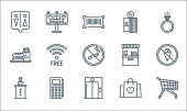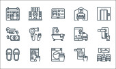 ikony linii hotelowej. zestaw liniowy. wysokiej jakości zestaw linii wektorowych, takich jak lokalizacja, karta magnetyczna, umywalka, śniadanie, lodówka, kapcie, ręka, sypialnia, router