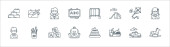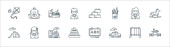 ikony linii przedszkola. zestaw liniowy. wysokiej jakości zestaw linii wektorowych, takich jak slajdów, zabawki obfitości, student, huśtawka, jedzenie, torba szkolna, koń bujany, latawiec