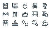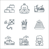 ikony linii przedszkola. zestaw liniowy. zestaw linii wektorowych jakości, takich jak bloki, student, huśtawka, piórnik, deska, pociąg zabawka, nauczyciel, książka