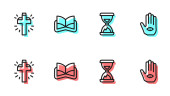 ikony duchowej linii. zestaw liniowy. wysokiej jakości zestaw linii wektorowych, takich jak Biblia, gołąb, świece, modląc się, Koran, przykazanie, Bóg, oko, bambus