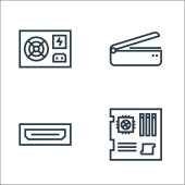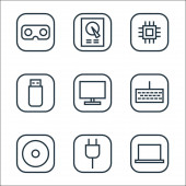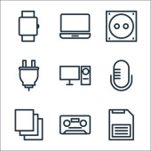 ikony linii sprzętu i gadżetów. zestaw liniowy. wysokiej jakości zestaw linii wektorowych, takich jak iwatch, drukarka, przewód zasilający, inteligentny zegarek, kamera wideo, dysk twardy, monitor TV