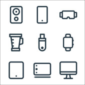 Zdjęcie "ikony linii sprzętu i gadżetów. zestaw liniowy. wysokiej jakości zestaw linii wektorowych, takich jak iwatch, drukarka, przewód zasilający, inteligentny zegarek, kamera wideo, dysk twardy, monitor TV" może być wykorzystywane do celów osobistych i komercyjnych zgodnie z warunkami zakupionej licencji Royalty-free. Obraz jest dostępny do pobrania w jakości wysokiej rozdzielczości do 5760x3840.