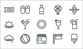 ikony linii pikniku. zestaw liniowy. wysokiej jakości zestaw linii wektorowych, takich jak okulary przeciwsłoneczne, taco, koc, kukurydza, łopatka, nóżka kurczaka, kanapka, badminton, grill