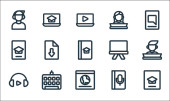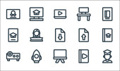 ikony linii nauki online. zestaw liniowy. wysokiej jakości zestaw linii wektorowych, takich jak projektor, samouczek wideo, słuchanie, smartfon, moździerz, uczenie się online, pulpit, student, światło