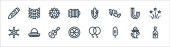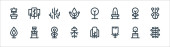 ikony linii dżungli. zestaw liniowy. wysokiej jakości zestaw linii wektorowych, takich jak chata, liść monstera, pień, góry, kompas, burza, wąż, maczeta