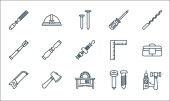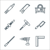 ikony stolarskie. zestaw liniowy. wysokiej jakości zestaw linii wektorowych, takich jak piła ręczna, wiertarka, skala, klucz, awl, śliwka, zacisk, dłuto