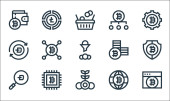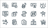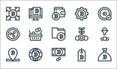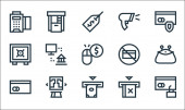 ikony linii pieniądza i waluty. zestaw liniowy. wysokiej jakości zestaw linii wektorowych, takich jak torba na pieniądze, portfel, metoda płatności, bankowość mobilna, moneta euro, chiński yuan, wykres, banknot euro, świnka