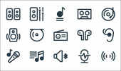 ikony linii muzycznej. zestaw liniowy. wysokiej jakości zestaw linii wektorowych, takich jak kasety, CD spalania, nuta muzyczna, winyl, tasowanie, wyciszenie, przenośny głośnik, melodia