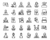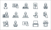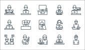 Zostań w ikonach domowej linii. zestaw liniowy. wysokiej jakości zestaw linii wektorowych, takich jak miotła, ćwiczenia, zamówienie online, fotograf, dzianiny, dziecko, rośliny podlewające, rozmowy