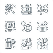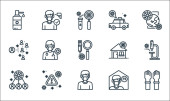 ikony linii wirusów. zestaw liniowy. zestaw linii wektorowych jakości, takich jak call center, ćwiczenia, wyszukiwanie, ludzie, płytka Petriego, alkohol, książka, laboratorium, analiza