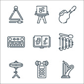 ikony linii muzycznej. zestaw liniowy. wysokiej jakości zestaw linii wektorowych, takich jak głośnik niskotonowy, talerze, francuski róg, gong, dysk, nuty, conga, słuchawki, nuta muzyczna