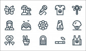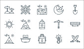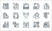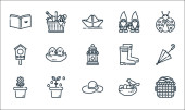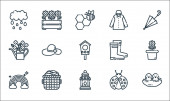 ikony sezonu wiosennego. zestaw liniowy. wysokiej jakości zestaw linii wektorowych, takich jak kwiat, burza, panna młoda, tęcza, ptak, konewka, płaszcz przeciwdeszczowy, turbina wiatrowa, ptak