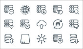 ikony linii serwerów biurowych. zestaw liniowy. zestaw linii wektorowych jakości, takich jak przełącznik, bezpieczne, przechowywanie danych w bazie danych, zapisać, info, serwer sieciowy, muzyka, edytować, pobieranie danych