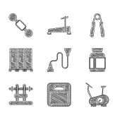 ikony linii fitness. zestaw liniowy. wysokiej jakości zestaw linii wektorowych, takich jak narzędzie kulturystyczne, uchwyt dłoni, rękawice bokserskie, trenażer, ekspander klatki piersiowej, drążek do podciągania, chodzik, narzędzie do ćwiczeń