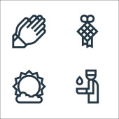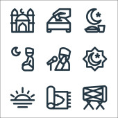 ikony linii Ramadan. zestaw liniowy. wysokiej jakości zestaw linii wektorowych, takich jak bedug, koraliki, półksiężyc, armaty, jałmużna, modlitwa, słońce, herbata